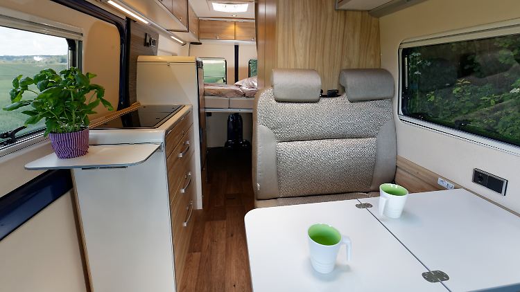 Daran schließen sich Ankleideraum und Sanitärbereich an, die mit einer Doppeltüre abgetrennt werden können. Der dahinterliegende Wohnbereich inklusive Kochzeile vermittelt ein großzügiges Raumgefühl. Und das Beste: Die geschickte Konstruktion der Sofalandschaft auf einem kleinen Podest samt einer hinten abschließenden Ablage, die allerlei Krimskrams aufnimmt, lässt genügend Raum für eine geräumige Heckgarage, die serienmäßig eine Traglast von 350 Kilogramm aufweist.