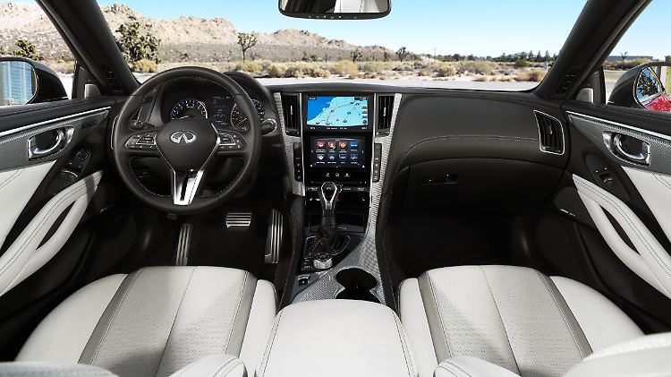 In Fahrt bringen den Q60 bei uns zwei Motoren: Ein 2,0 Liter großer Vierzylinder, bei dem sich mit 211 PS und 350 Newtonmeter der Funkenflug in Sachen Fahrfreude eher in Grenzen halten dürfte. Und ein nagelneuer V6-Benziner, der mit drei Litern Hubraum dem Diktat des Downsizings folgt und den bisherigen 3,7 Liter ersetzt. Mit zwei angenehm spontanen Turbos gekoppelt, bringt er es auf 405 PS und geht mit bis zu 475 Newtonmeter zu Werke. Dank einer flotten Automatik und dem beim Sechszylinder serienmäßigen Allrad-Antrieb reicht das für einen Sprintwert von 5,0 Sekunden. Und natürlich schafft der V6 mühelos das von der Konkurrenz vorgegebene Klassenziel von 250 km/h. Nur sonderlich sparsam ist der Flachmann nicht: Für den Vierzylinder nennt Infiniti einen Normverbrauch von 6,8 und für den V6 stehen sogar 9,1 Liter in der Liste.