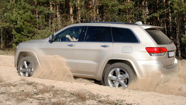 Der Grand Cherokee Overland ist mit permanentem Vierradantrieb mit Geländeuntersetzung und variabler Drehmomentverteilung ausgestattet. Zusätzlich erhöht ein elektronisches Sperrdifferenzial mit optionaler Schlupfbegrenzung die Offroad-Fähigkeiten. Die serienmäßige Luftfederung bringt eine variable Bodenfreiheit mit sich, die per Knopfdruck zwischen etwas mehr als 20 und 27 Zentimetern verändert werden kann. Beim Fahren auf höchsten, "Offroad 2" genannten Niveau, stellt sich beim Testwagen allerdings ein unerwarteter Effekt ein. Das Überqueren von groben Wurzeln oder Rillen, das Eintauchen in Fuchs- und Schlaglöcher war mit lautem Poltern an den Radaufhängungen verbunden. Bei abgesenktem Karosserieniveau auf nicht minder holperigen Waldwegen oder auf Kopfsteinpflaster war diese Fahrwerksreaktion aber nicht zu beobachten. Getriebeuntersetzung für steile Anstiege, Bergabfahrhilfe für die umgekehrte Richtung, Programmwahl für wechselnde Untergrundbeschaffenheit – alles easy und bequem per Taste oder Drehknopf zu bedienen.