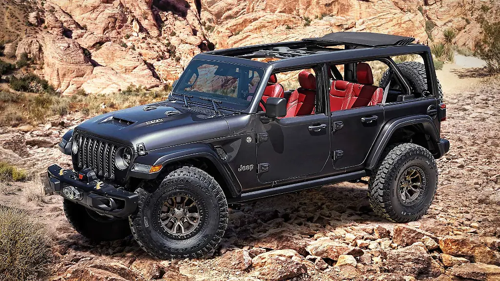 Der letzte offiziell vorgestellte V8-Wrangler feierte 1981 sein Debüt. Damals leistete die 5,0-Liter-Maschine im Jeep CJ rund 130 PS, was wenig mehr als lässiges Cruisen erlaubte. Anders der neue V8: Unter der geschlitzten Haube des Wrangler Rubicon 392 Concept steckt eine 6,4-Liter-Maschine, die 456 PS und 610 Newtonmeter maximales Drehmoment bereitstellt. In Kombination mit einer Achtgangautomatik soll der viertürige Allradler den Sprint auf 100 km/h in gut fünf Sekunden absolvieren.