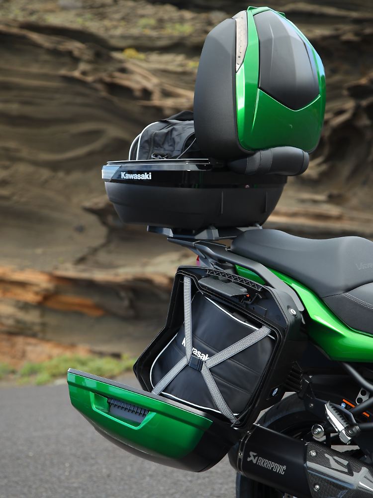 Das Fahrwerk der Versys ist ausgewogen; sie lenkt leicht ein, bleibt stets stabil auf Kurs und bietet guten Komfort. Die semiaktive Regelungsfunktion zeigt sich jeder Situation gewachsen. Dieselben guten Noten erhält das Dreischeiben-Bremssystem, das im Fall der SE-Version sogar über eine Kurvenfunktion verfügt. Es sind eher Kleinigkeiten, in denen dieser grüne "Stelzentourer" noch ein Quäntchen souveräner auftreten könnte. Die Windschildverstellung erfordert das Betätigen zweier Rändelschrauben und ist deshalb nicht einhändig bedienbar, schön wäre auch eine Blinker-Rückstellautomatik oder eine elektronische Reifendruckkontrolle. Das Höchsttempo mit montierten Seitenkoffern - die Behälter sind ausreichend groß und funktional tadellos - ist auf 130 km/h limitiert. Ein sehr geräumiges Topcase ist Bestandteils des zusätzlichen, 1100 Euro Aufpreis kostenden "Grand-Tourer"-Angebots.