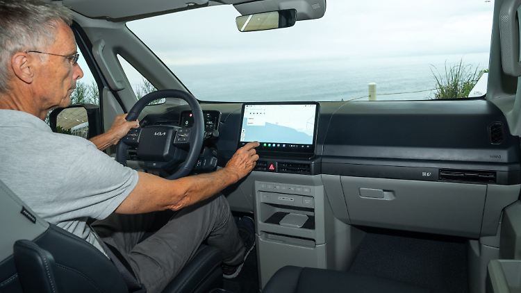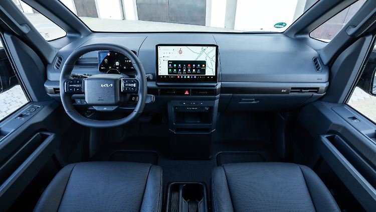 Das Cockpit gestaltete Kia modern und aufgeräumt, der Lieferwagen-Charakter blieb draußen, die Materialien sind gefällig, Ablagen gibt es in Hülle und Fülle, ebenso eine Ladeschale fürs Handy. Wie meist, dominiert auch hier der zentrale, 12,9 Zoll große Bildschirm (Touchscreen). Hinter dem Lenkrad dagegen reicht ein kleines Display (7,5 Zoll). An der Bedienung gibt es nichts auszusetzen, sie erschließt sich intuitiv. Gleiches gilt für die Sprachsteuerung, unterstützt von einem KI-Assistenten, was die Konversation erheblich vereinfacht.