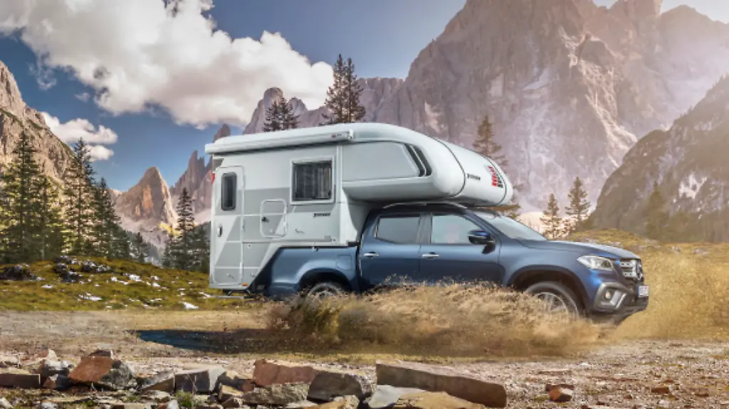 Eine dritte, nicht minder interessante Lösung ist bei Aufbauhersteller Karlheinz Wanner zu sehen: die erste Monocoque-Kabine für die X-Klasse. Silverdream Pick-up heißt die gut vier Meter lange und 2,20 Meter breite Kabine, die nahtlos aus Glasfaser-Kunststoff (GfK) mit einer Polyurethan-Schaum-Isolierung (PU) gefertigt wird. Längsbetten im Alkoven mit üppigen Ausmaßen von 2,00 Meter mal 1,70 Meter versprechen bequemen Schlafkomfort. Insgesamt ist das Fahrzeug knapp sechs Meter lang und wird als 3,5-Tonner auf den Markt kommen.