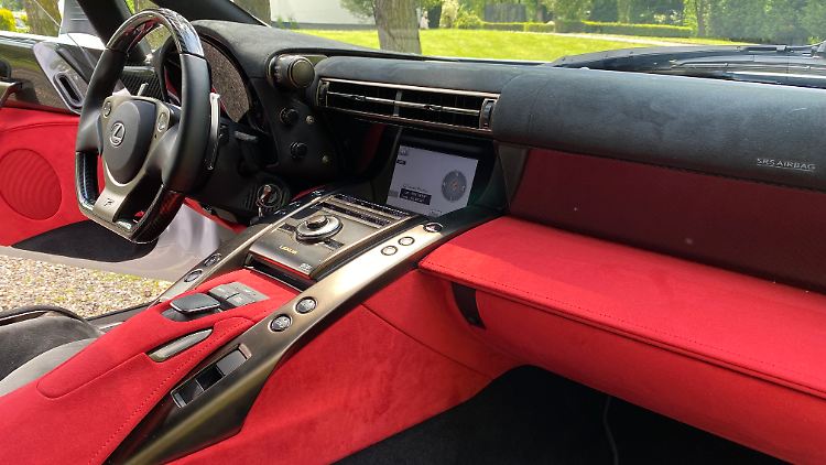 Doch so langsam möchte der LFA bewegt werden - eine eigentliche banale Sache, die bei derartigen Ikonen dennoch nicht allzu oft vorkommt. Das Entern des Sportlers gelingt jedenfalls besser, als das bei manch anderen Extrem-Autos der Fall ist. Angekommen im sündhaft teuren LFA, fühlt es sich ein bisschen an wie in einem deutlich günstigeren Lexus. Zwischen reichlich Wildleder - oben in Grau, weiter unten in Rot - lugt im Bereich der Mittelkonsole fast schon verschämt eine Carbon-Dekorleiste hervor.