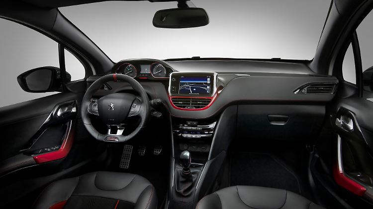 Im Innenraum ist die Hommage an den 205 GTi am satinierten Chrom und den farbigen Ziernähten zu erkennen. Die finden sich dann auch an der Armaturenbrettverkleidung, den Ledersportsitzen, am Sportlederlenkrad, sowie an Schalthebel und Handbremse. Die schwebenden Armaturen des Franzosen mit in Chrom eingefassten Rundinstrumenten auf gebürstetem Aluminium werden von roten LEDs beleuchtet. Ebenfalls aus Aluminium ist die Pedalerie.