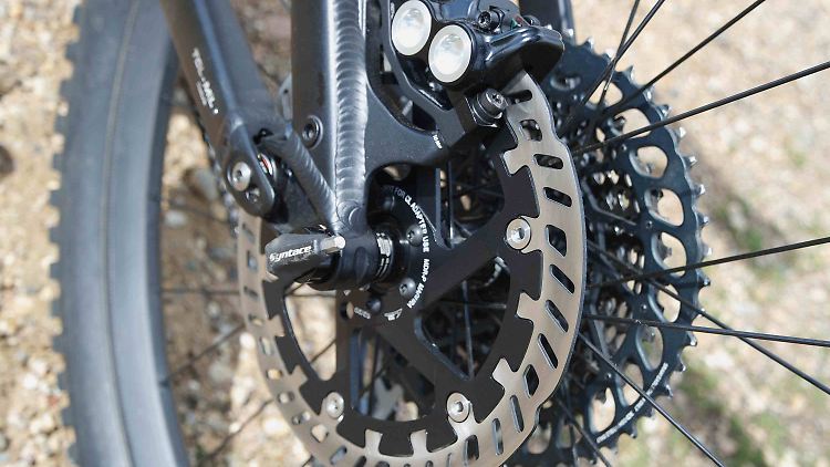 Man muss schon etwas genauer hinschauen, um eine Besonderheit der XL-Scheiben wahrzunehmen. Im Falle des Test-Bikes wurde die leichtere und teurere MDR-P-Variante und damit das heimliche Highlight der eStop-Familie verwendet. Wie bei zweiteiligen Bremsscheiben mit Schwimmendlagerung üblich, sind auch bei der MDR-P-Scheibe innerer und äußerer Kranz über Nieten verbunden. Doch Magura setzt zusätzlich noch auf eine patentierte 360-Grad-Verzahnung beider Elemente. So wird das am äußeren Kranz anliegende Drehmoment über die gesamte Ringfläche statt nur über die sonst üblichen sechs Nieten übertragen. Damit vereint die MDR-P-Scheibe Vorteile einer zweiteiligen Scheibe mit Schwimmendlagerung mit der Performance einer einteiligen Scheibe.