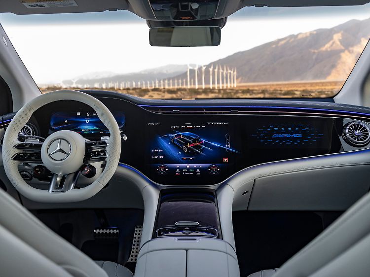 Im hügeligen wie teilweise unterhaltsam-kurvigen Hinterland nördlich von San Diego haben wir die Spaß-Leine dennoch etwas länger gelassen, was im Zusammenspiel mit der synthetischen Sound-Untermalung ein den Buchstaben AMG durchaus würdiges Fahrspaß-Feeling aufkommen ließ. Fahrwerk, Allradantrieb, Lenkung und Bremsen wurden von AMG in souveräner Weise für flotte Kurventänzchen optimiert beziehungsweise dimensioniert. An der Vorderachse kommen, sofern man in die optionalen Keramik-Verbundbremsen investiert, 44 Zentimeter große Scheiben zum Einsatz, die von Sechskolben-Bremssätteln in die Hände genommen werden. Eng und schnell ums Eck half uns außerdem eine Hinterachslenkung, die den Kurvenradius trotz XL-Radstand klein hält. Als rassiger Sportwagen kann der auf 1,93 Meter hochgebockte EQE angesichts seiner Masse und der erhöhten Sitzposition zwar nicht vollends überzeugen. Doch ein Premium-Komfort-Cruiser, der seine Gäste derart brutal in Seitenwangen und Rücklehnen drücken kann, hat seinen Reiz.