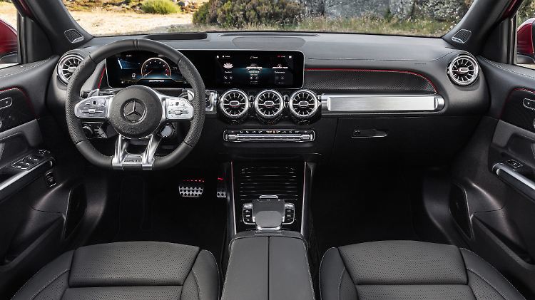 Sportsitze und rote Akzente weisen den GLB 35 im Innenraum unter anderen als AMG aus.