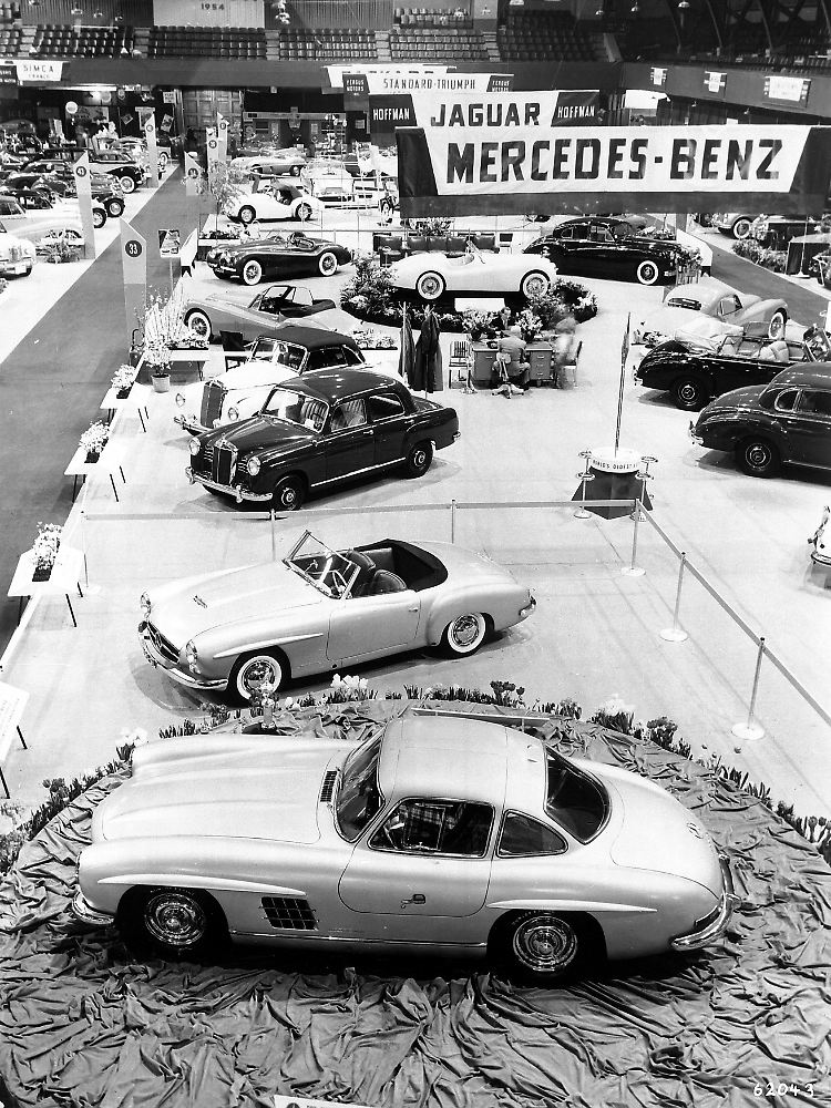 1954: Der Mercedes-Benz 190 SL (W121) und der Mercedes-Benz 300 SL "Gullwing" (W198) debütieren am 6. Februar auf der International Motor Sports Show in New York. Weltpremiere des 190 SL im Februar in New York auf der International Motor Sports Show. Die finale Typenbezeichnung wird erst wenige Tage vor der Enthüllung festgelegt. Während der Entwicklung wird der Typencode 180 SL genutzt. Eigentlich soll der Mercedes 190 SL im November in Serienproduktion gehen, aber der Produktionsstart wird verschoben. Ab Sommer werben Verkaufsbroschüren für den neuen SL. Auch ein motorsportliches Ereignis fasziniert die Mercedes-Fans im Jahr 1954, es ist der erste Start der Formel-1-Silberpfeile Mercedes-Benz W196 R und der Doppelsieg in Reims (Juan Manuel Fangio/Karl Kling) beim Großen Preis von Frankreich