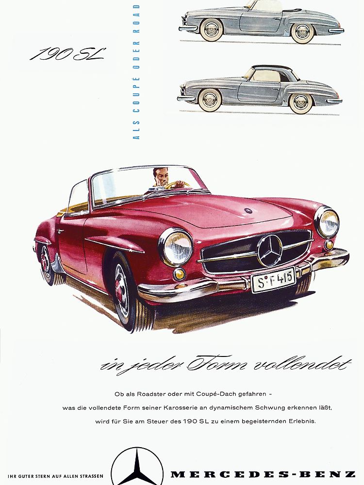 Glamour vor dem Grand Hotel und Gran-Turismo-Talente dank zuverlässiger Mercedes-Großserientechnik, mit dieser Kombination gewann der 190 SL auch die Herzen der Damen der besserverdienenden Gesellschaft von Hollywood bis Frankfurt treffsicherer, als es kapriziöse Engländer oder Italiener vermochten. Der Mercedes 190 SL brach sogar mit dem Doris-Day-Frauenbild der 1950er, nach dem die Damen in Luxusautos grundsätzlich auf dem Beifahrersitz Platz nahmen und sich in Werbeanzeigen über Accessoires wie den Schminkspiegel freuten, aber allenfalls in Kleinwagen selbst hinter dem Steuer zu finden waren.