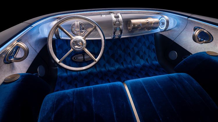 Im Innenraum herrscht Retro-Futurismus. Beim Öffnen der Tür begrüßt das Fahrzeug seine Passagiere mit einer analogen Animation, die von feinen Chronographen inspiriert ist. Dunkelblaue, plüschige Bezüge treffen auf Art-Deco-Elemente, die laut Mercedes eine "völlig neue Art des hyperanalogen und digitalen Luxus" schaffen sollen.