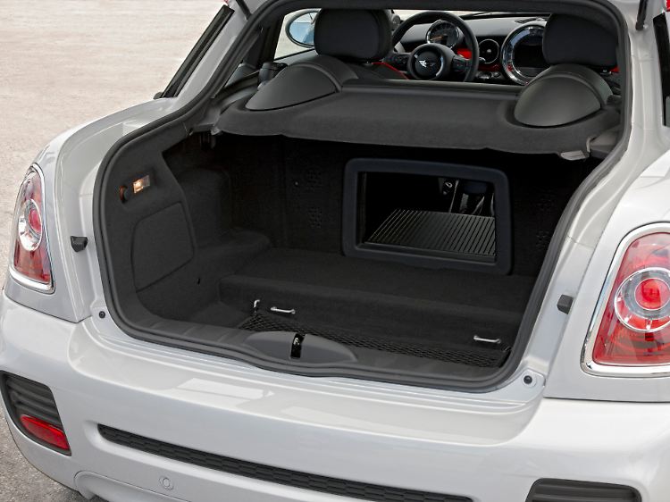 Unterhalb der Schulterlinie bleibt auch das Coupé ein klassischer Mini. Die runden Scheinwerfer, die kurzen Karosserieüberhänge und die vertikalen Rückleuchten finden sich so auch an der Limousine. Anstelle des topfebenen Daches erhält das Coupé aber eine niedrige helmförmige Kuppel, unter der zwei Passagiere Platz finden. Dahinter schließt sich ein kurzes, knackiges Heck mit ausfahrbarem Spoiler an. Die Rückbank entfällt zu Gunsten eines größeren Kofferraums. Dieser kann über eine große, mitsamt dem Fenster aufschwingende Heckklappe beladen werden.