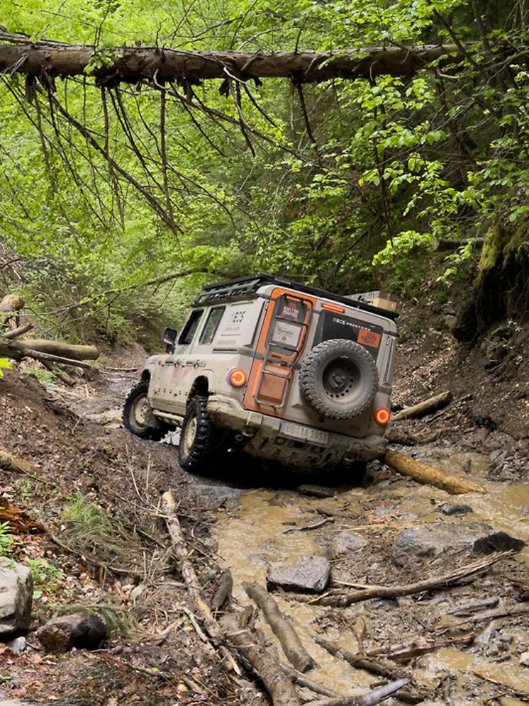 Denn viel mehr als 50, 60 km/h sind in den Karpaten selbst auf den wenigen Straßen kaum zu schaffen, vom Gelände ganz zu schweigen. Denn immer wieder kämpft sich der Tross durch knappe Hohlwege oder Bachbetten und gerät dabei nur allzu oft in gefährliche Schräglagen, die der Ineos mit seinem tiefen Schwerpunkt aber ohne Murren meistert. Und natürlich setzt er gelegentlich auch mal auf dem Unterfahrschutz auf, den er wie einen Schildkrötenpanzer am Bauch trägt.