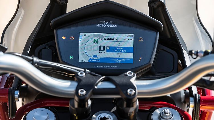 Als Höchstleistung sind 80 PS bei 7750 Kurbelwellenumdrehungen für den V2 angegeben, dessen mächtige Zylinder Guzzi-typisch seitlich unter dem Tank in den Fahrtwind ragen. 80 Newtonmeter bei zivilen 5000 Touren werden im Datenblatt als Drehmoment-Maximum notiert. Sobald die Drehzahl-Anzeige im etwas verspielt wirkenden TFT-Display gut 3000 Umdrehungen anzeigt, ist das Triebwerk sehr präsent und schiebt die vollgetankt 229 Kilogramm schwere Guzzi nachdrücklich an. Um die 6000er Marke kommt unter kräftigem Grollen aus dem Ansaugtrakt auch Spritzigkeit auf. Wer von der TT – die Abkürzung steht für "tutto terreno", auf Deutsch "fährt in jedem Gelände" – Quirligkeit erwartet, liegt falsch: Ihre Stärke ist souveränes Gleiten, gerne auch sehr flott.