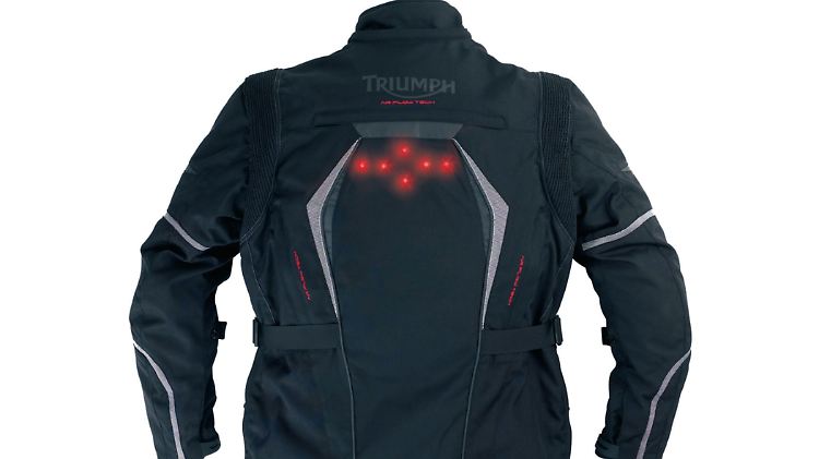 Das Gesehenwerden ist für Motorradfahrer besonders wichtig. Bike-Hersteller Triumph hat daher eine Jacke mit integrierter Beleuchtung entwickelt, die ab sofort für 499 Euro bei den Händlern der Marke angeboten wird. An der vorderen Schulterpartie strahlen zwei Paare von jeweils drei LED-Leuchten weißes Licht nach vorne, auf dem Rücken finden sich sechs kreuzförmig angeordnete Dioden.