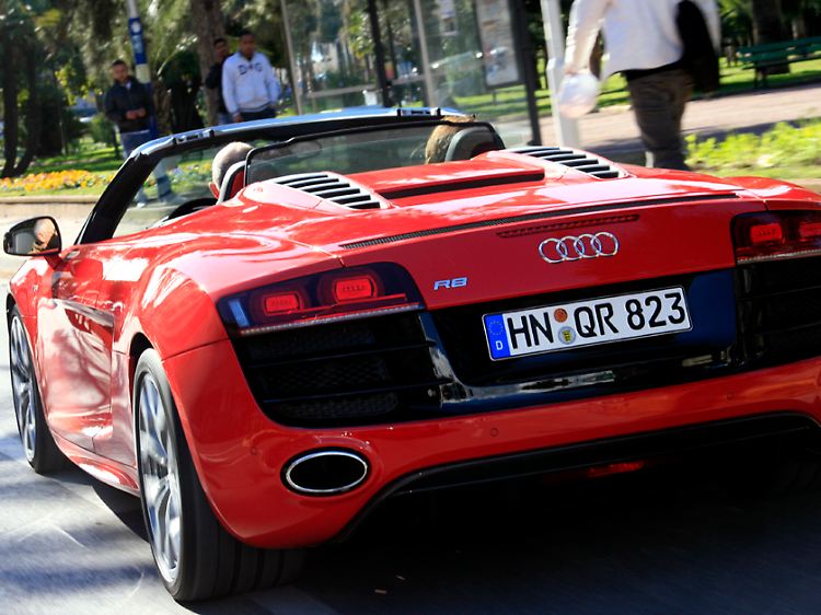 Um das Interesse der Kunden, die solche Summen nicht aus der Portokasse zahlen, in Reichweite zu halten, wird eine Rechnung über das Ausstattungsniveau aufgemacht. Serienmäßig bietet der R8 Spyder das hauseigene Navigationssystem "plus", LED-Scheinwerfer und eine Bang & Olufsen-Musikanlage, die trotz des kleinen Volumens der Passagierkabine einen respektablen Sound zustande bringt. Dass sie allzu oft zum Einsatz kommt, ist nicht zu erwarten, denn noch mehr Ohrenschmaus ist vom V10-Triebwerk zu bekommen. Kraftvoll und im Bedarfsfall bissig, wie von Ferne grummmelnd oder mit drohendem Fauchen verschafft sich das Triebwerk Gehör. Die drehzahlabhängigen Melodien sind so sensibel austariert, dass der Geräuschpegel nie ins vordergründig Krawallige entgleitet, wie es beispielsweise von einem Lamborghini Gallardo zu vernehmen ist. Maskuliner Spieltrieb bricht sich unverhofft Bahn, wenn vor jeder Tunneldurchfahrt ein bis zwei Gänge zurück geschaltet wird und die Schallwellen anschließend die Wände erbeben lassen.