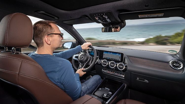 Also, die Türen fernentriegelt, dem Familienfreund zugezwinkert und rein in die Kiste. Und guck, eigentlich erwartet man hier das Interieur der A-Klasse, denn beide Fahrzeuge nutzen die gleiche Architektur, aber, oh Wunder, die Raumarchitektur der B-Klasse ist eigenständig. Klar, Lenkrad und die fünf scharfen Lüftungsdüsen in hinterleuchteter Turbinenoptik sind ebenso wiederzuerkennen wie die freistehende Bildschirmeinheit. Dafür schwingt die Armatur zum Beifahrersitz aus und wird dort von einem frei wählbaren Dekor-Teil überblendet. Ob das sportlich ist, ist ebenso streitbar wie die recht flach geratenen Türinnenverkleidungen mit den waagerechten Armauflagen. Vorteil: darunter verschwinden locker 1,5-Liter-Flaschen.