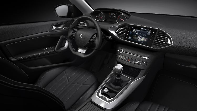 Auch im Innenraum will Peugeot eigene Akzente setzen. So kommt beim 308 die schon aus dem Kleinwagen 208 bekannte ungewöhnliche Cockpit-Architektur zum Einsatz. Das Lenkrad ist vergleichsweise klein und tief montiert. Auf die Instrumente blickt man nicht wie sonst üblich durch den Kranz, sondern über den Volant hinweg. Dadurch soll die Anzeige deutlich ins Blickfeld des Fahrers rücken und nach Annahme von Peugeot werden so die Augen des Fahrers kürzer von der Straße genommen. Ebenfalls vom 208 übernommen wird die Touchscreen-Steuerung für Infotainment-, Navi- und Klimafunktionen. Ergebnis ist ein sehr aufgeräumter, fast puristisch wirkender Fahrerarbeitsplatz, bei dem sich alles auf das Multifunktionsgerät konzentriert.