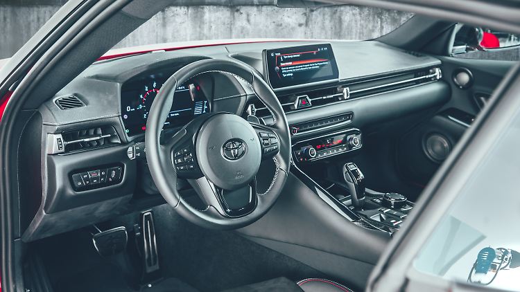 Der Innenraum selbst erinnert stark an den BMW Z4. Zwar hat Toyota das Design der digitalen 8,8-Zoll-Instrumente angepasst, die Lufteinlässe überarbeitet und eine andere Klima-Steuerung eingebaut. Doch Lenkradtasten, der BMW-typische Automatikwählhebel, der aufgesetzte, ebenfalls 8,8 Zoll große Infotainment-Bildschirm und nicht zuletzt der iDrive-Bedienknubbel zeugen vom Münchner Einfluss. Erstaunlich: Dank der Ausbeulungen im Dach sitzen auch fast zwei Meter große Fahrer ziemlich gut im Supra und der Ein- und Ausstieg fällt leichter als vermutet.