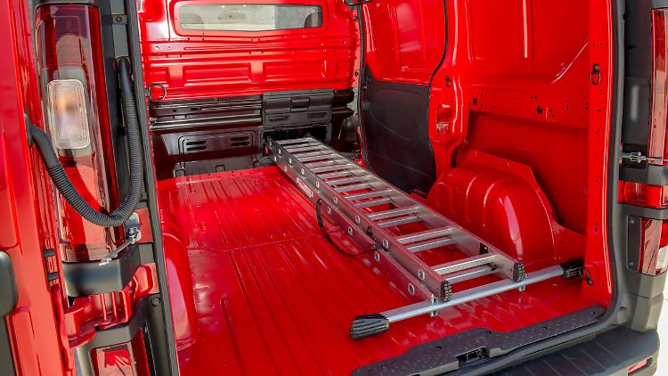 Aufgrund einer Durchladeklappe in der Trennwand lassen sich bis zu 3,75 Meter lange Gegenstände transportieren. Bei der längeren Auslegung des Fahrzeugs (L2) sind es 4,15 Meter.