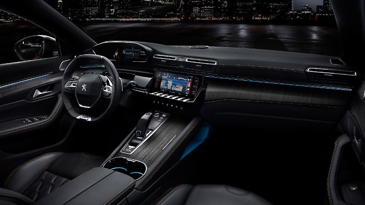 Optisch folgt der Peugeot dem in der Mittelklasse aktuell grassierenden Coupé-Trend, trägt ein hinter den Vordersitzen abfallendes Dach, eine große Heckklappe und sogar rahmenlose Fenster. Innen findet sich das typische Peugeot-Cockpit mit sehr kleinem Lenkrad und hoch angesetzten Instrumenten. Dominiert wird der Raum von einer wuchtigen Mittelkonsole.