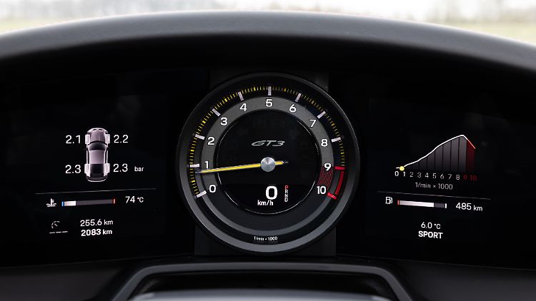 Nehmen wir mal etwas Geschwindigkeit aus der Fahrt und werfen eine Blick auf den Track-Screen. Der ist nämlich neu. Per Knopfdruck reduziert er die Digitalanzeigen links und rechts des typisch analogen, bis 10.000 Touren reichenden Drehzahlmessers, auf die Informationen wie Reifen- und Öldruck, Öltemperatur, Füllstand des Tanks und natürlich Kühlwassertemperatur. Eben auf alles, was beim Rundeneinsatz wichtig ist. Ach so, für die Freunde der Handschaltung: Der GT3 wird natürlich auch wieder mit manuellem Sechsganggetriebe angeboten, hier informiert ein optischer Schaltassistent mit farbigen Balken links und rechts des Drehzahlmessers sowie einem aus dem Motorsport abgeleiteten Schaltblitz über den optimalen Schaltpunkt.