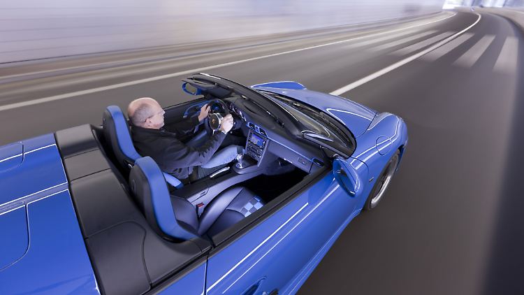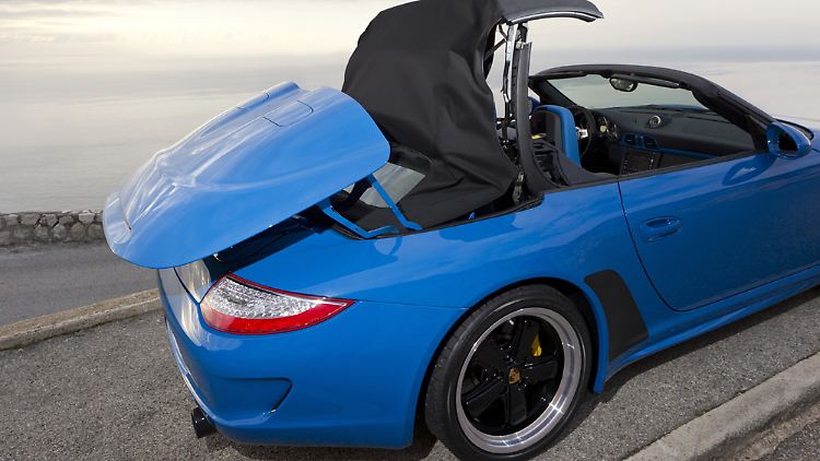 Weitere typische Merkmale des Speedsters sind die verkürzte Frontscheibe, die zwar nicht stärker geneigt ist als beim herkömmlichen Cabrio, durch das angepasste Stoffverdeck und die kleineren Seitenscheiben jedoch zu einer auffällig flacheren Silhouette für das ganze Auto führt. Dafür wird hinten ordentlich dick aufgetragen: Das Heck ist so breit wie beim Turbo, die schwarz kontrastierten Steinschlag-Schutzfolien verstärken den optisch athletischen Eindruck noch. Hundert Millimeter im Durchmesser gähnen die schwarz lackierten und nano-beschichteten Endrohre unter der extra entwickelten Heckverkleidung. Die Öffnungen sind obendrein noch mit einem Gittereinsatz verziert.