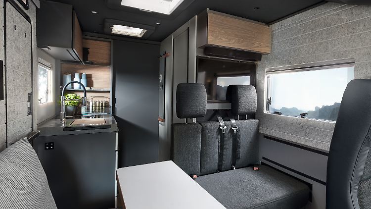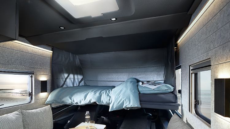 Freie Sichtachsen ziehen sich durch das gesamte Fahrzeug. Die Lounge-Sitzanordnung mit zwei gegenüberliegenden Längssofas sorgt für ein großzügiges Raumgefühl und für Bewegungsfreiheit. Dabei gehört die schwenkbare Zweierbank auf der Fahrerhausseite zu den Patent-geschützten Neuheiten. Während der Fahrt kann sie um 90 Grad gedreht werden und bietet dann für zwei weitere Mitfahrer gurtgeschützte Plätze an. Das optionale Hubbett, das dank einer besonderen Matratzenform vollständig, für das Auge kaum wahrnehmbar, in der Decke verschwindet, böte sich dann für die Nachtruhe an.
