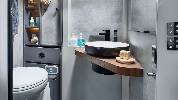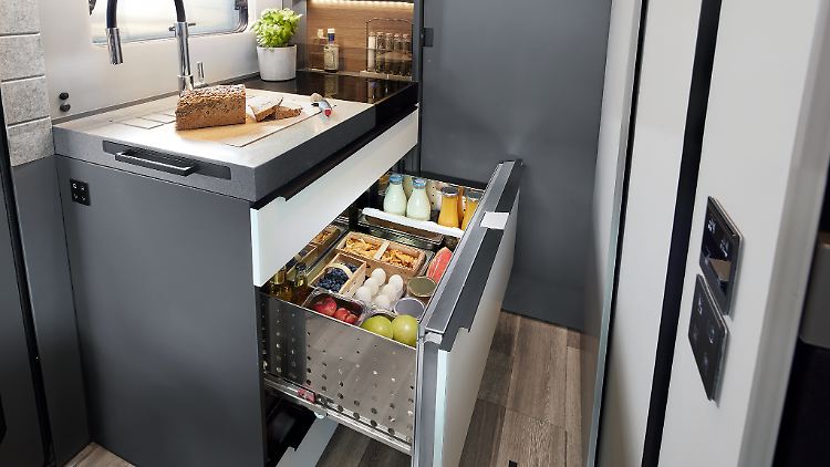 Auch Küche und Bad offerieren neuartige Lösungen. Eine besonders pfiffige Idee ist ausziehbare Abdeckung für den Zwei-Flammen-Kocher, die über den Gang geschoben wird und das Ganze in eine L-Küche mit großer Arbeitsfläche verwandelt. Wer die optionale Premium-Küche wählt, bekommt zudem noch ein elektrisch hochfahrendes Apothekerregal und einen großen 140-Liter-Schubenladen-Kühlschrank, in dem auch große Flaschen problemlos untergebracht werden können. Das gegenüberliegende Bad ist ebenerdig ohne Stufe und mit einer ebenfalls patentierten Schiebemechanik entweder als Toilette mit Waschbecken oder als Dusche nutzbar.