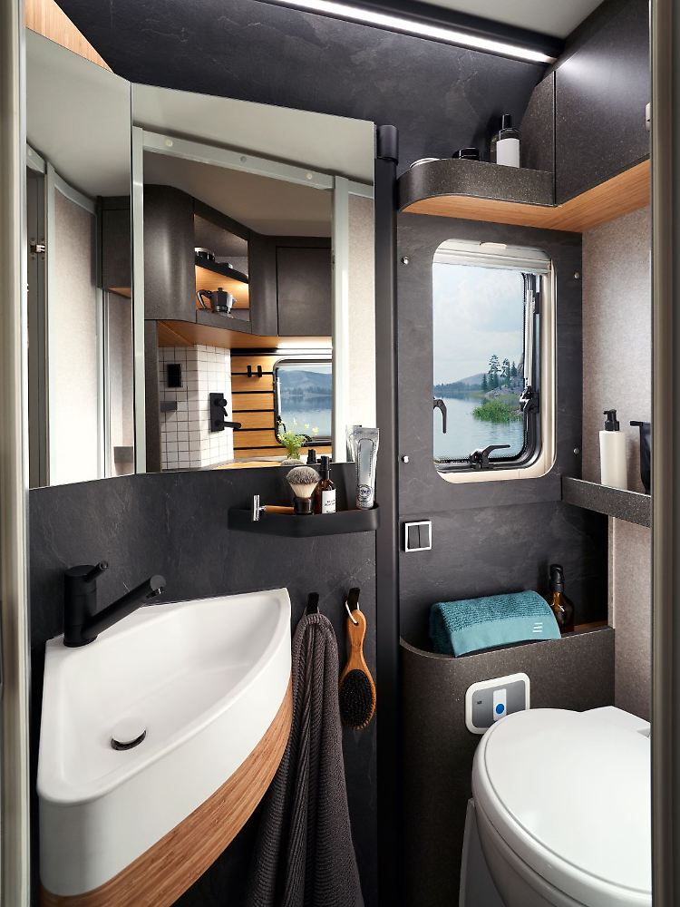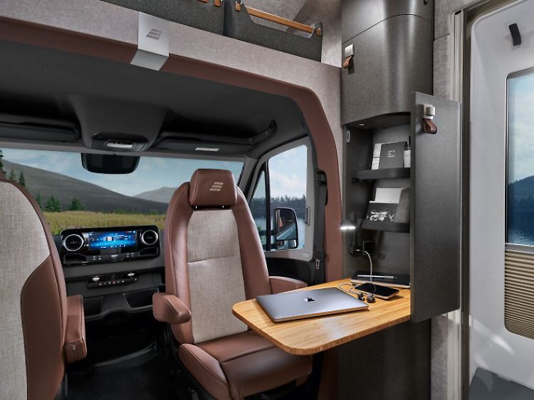Das wandelbare Vario-Bad lässt sich dank einer Schwenkwand in Schieferoptik mit wenigen Handgriff in eine größere Nasszelle mit bodenebener Dusche verwandeln. Wer unterwegs nicht nur entspannen, sondern auch arbeiten muss, dem bietet der Venture S ein Homeoffice. Der in der Seitenwand hinter dem Beifahrersitz integrierte Arbeitstisch lässt sich mitsamt biegsamem Oberlicht in wenigen Sekunden als individueller Arbeitsplatz einrichten.