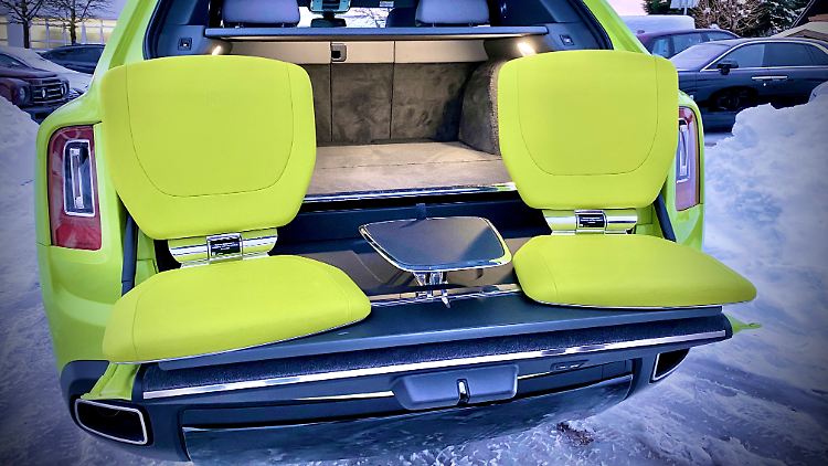 Auf so einen Gag können nur die Briten kommen: Campen mit dem Cullinan versüßen die eingebauten Klappstühle im Gepäckabteil nebst edel anmutendem Tischchen.
