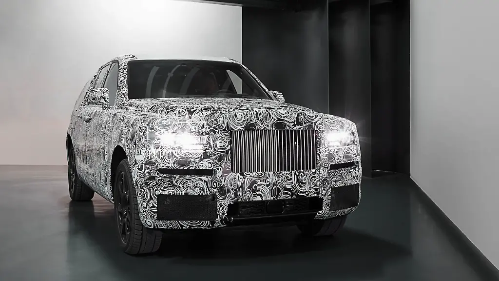 Rolls-Royce gestattet erstmals einen Blick auf sein kommendes SUV-Modell. Die Karosserie ist auf den Fotos noch mit Tarnfolie beklebt, erkennbar sind aber der wuchtige Kühlergrill, die typisch horizontalen Leuchten und eine lange Motorhaube. Einen Namen für ihr erstes SUV nennen die Briten noch nicht, bislang läuft es intern unter dem Code "Cullinan", benannt nach dem größten jemals gefundenen Diamant.