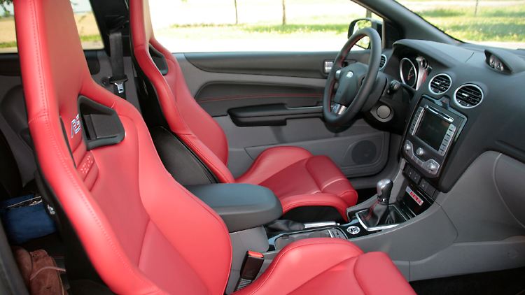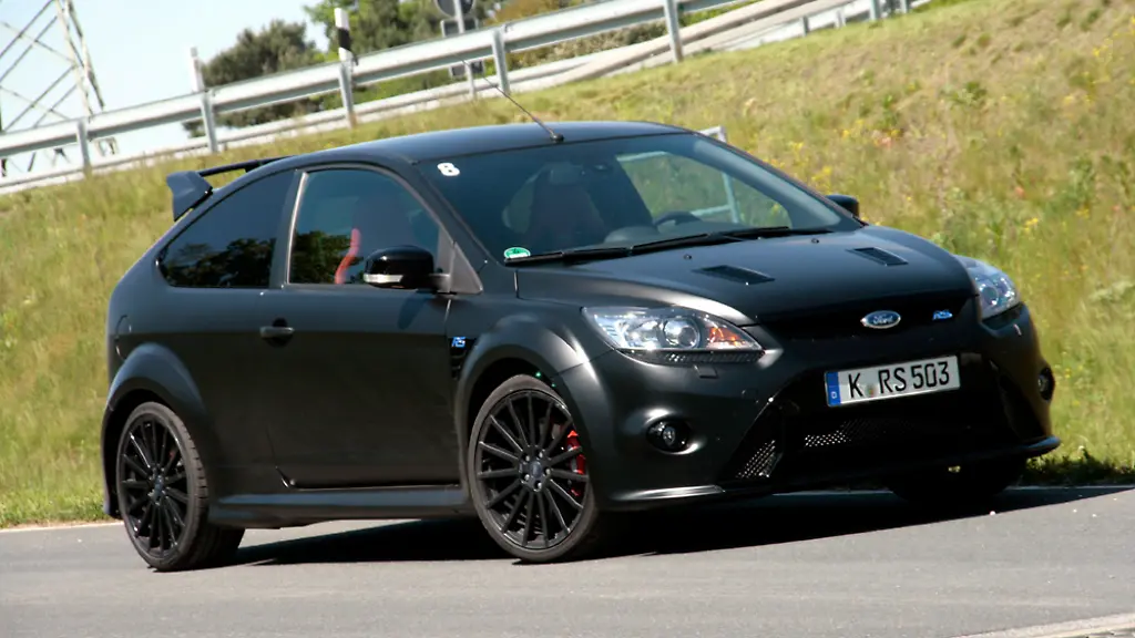 Mit seinen Kotflügelverbreiterungen, 19-Zoll-Felgen und Dachspoiler ist der "normale" Focus RS schon ein Hingucker, der RS 500 legt noch eine Schippe drauf. Kohle, um im Bild zu bleiben, rabenschwarz und matt, so ist die Außenhaut des finsteren Renners. Zunächst läuft das Auto mit einem schwarzen Metalliclack versehen von Band, um dann in einem aufwändigen manuellen Verfahren mit einer stumpf schimmernden Folie bezogen zu werden. Drinnen prägen rote Schalensitze die Szenerie, die gleichermaßen stabil und anschmiegsam sind und wohl auch Rallyepilot Marcus Grönholm Freude machen würden. Außer den RS-typischen Zusatzinstrumenten für Öldruck, Öltemperatur und Ladedruck ist vor allem eines wichtig: Die Plakette auf der Mittelkonsole, die das Fahrgerät als Mitglied des exklusiven 500er-Clubs ausweist – so wenige Exemplare gibt es europaweit.