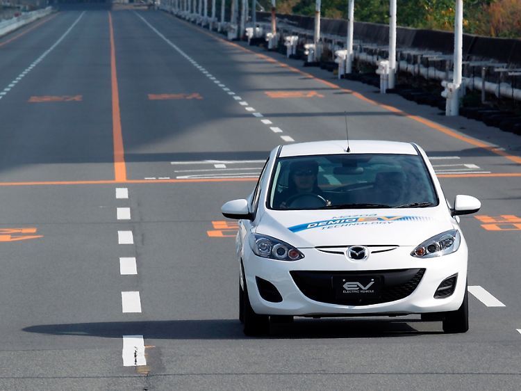 Laut Mitsuru Fujinaka kam es bei der Entwicklung darauf an, dass auch ein Strom-Demio seinen Nutzern das bietet, was die Marketing-Strategen der Marke als "Zoom-Zoom-Fahrgefühl" bezeichnen: Zügige Beschleunigung, agiles Handling, leichte, präzise Lenkung, sportlich-straffe Federung. Abgezählte Runden auf der firmeneigenen Teststrecke in Hiroshima konnte zumindest eines belegen: Flott ist er, der kleine Stromer, summt sich leise und ohne Durchhänger bis auf 100 km/h hoch, gewinnt beim Bremsen Energie zurück und scheint auch die Reichweiten-Vorgaben in Reichweite zu haben: Nachdem etliche Testfahrer bereits das Beschleunigungsvermögen ausprobiert und wenigstens 50 Kilometer unter verschärften Bedingungen absolviert hatten, versprach die Reichweiten-Anzeige noch immer 94 Kilometer.