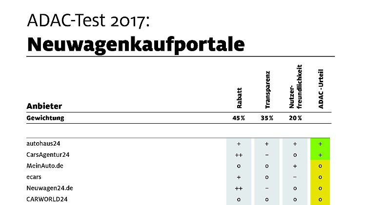 Mit Autohaus24 und CarsAgentur24 wurden lediglich zwei Portale mit einem "gut" benotet, einzig der Plattform APL wurde ein "mangelhaft" ausgestellt, während der Rest im Mittelfeld landete. Das Portal APL konnte zwar mit hohen Rabatten beeindrucken, doch zeigten sich im Gegenzug deutliche Mängel bei der Benutzerfreundlichkeit und der schon erwähnten Transparenz.