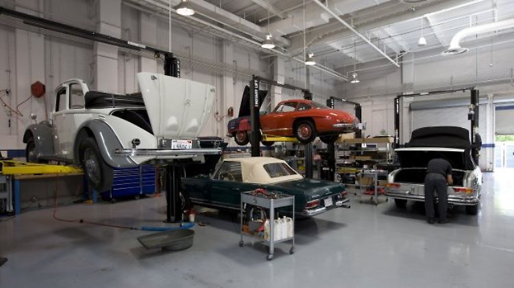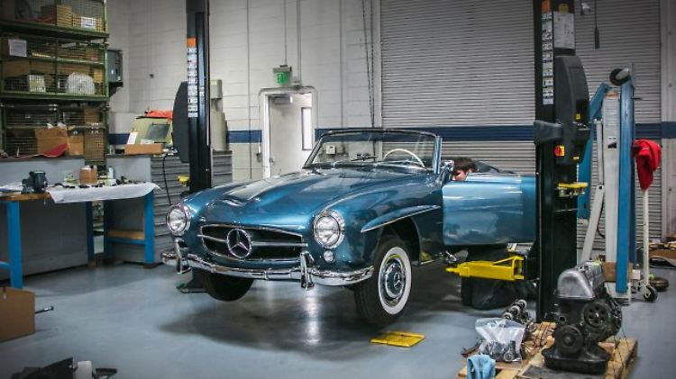 Ausgerüstet sind die Mechaniker in Irvine für das volle Programm: Sie erledigen Karosseriearbeiten, können lackieren, Motoren prüfen, Metallteile nachbauen und Schreinern oder Sattlern. "Doch komplette Restaurierungen sind bei uns eher selten", sagt Lander. Vielmehr lassen die allermeisten Kunden ihren Wagen hier fast so warten, wie einen neuen Mercedes in einer normalen Werkstatt. "Sie wollen einfach sicher sein, dass alles funktioniert und sie damit im Alltag möglichst wenig Probleme haben", erläutert der Mechaniker: "Denn die meisten fahren ihre Autos Tag für Tag." Das gilt laut Landers nicht nur für die Autos aus den Jahren 1955 bis 1971, die das Gros der Flotte stellen. "Wir haben zum Beispiel auch einen Kunden mit einem Benz von 1890, der ihn regelmäßig nutzt."