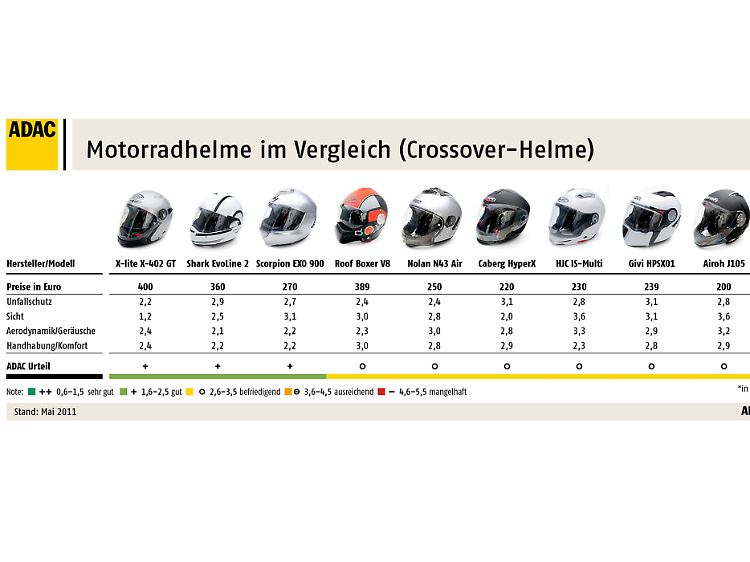 Ebenfalls mit "gut" bewertet wurden zudem der Shark Evoline 2 (360 Euro) und der Scorpion Exo 900 (270 Euro). Mit 389 Euro ist zwar der Roof Boxer V8 teurer, er erhielt aber nur ein "befriedigend", ebenso wie die übrigen Helme. Günstigster Testaspirant war der Probiker KX 4 für rund 150 Euro.