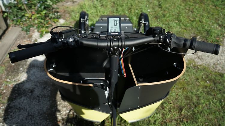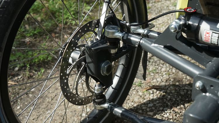 Weitere Unterschiede, die ein Fahrrad mit zwei Vorderrädern mit sich bringt: Die Bremsleistung der Scheibenbremsen - eine rechts, eine links, mit je 200 Millimeter Scheibendurchmesser - verdoppelt sich quasi. Und weil das Bike dreispurig ist, ist es weniger kippgefährdet als ein Lastenrad mit zwei Rädern.