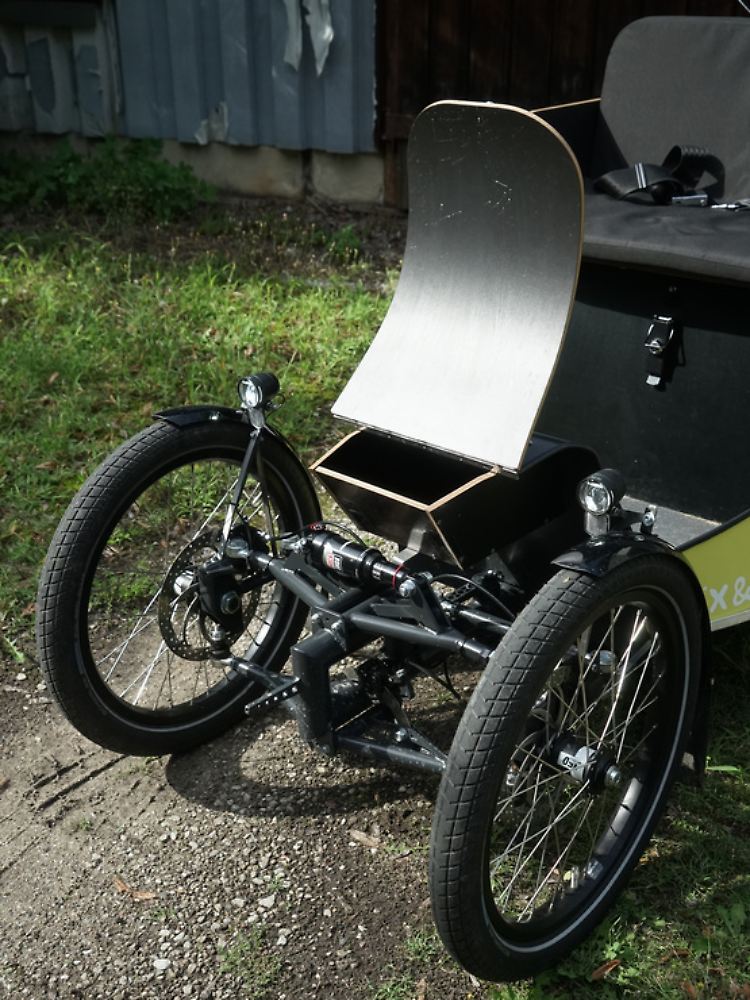 Querlenker und Luftdämpfung: Das Fahrwerk des Passenger-Bikes bietet Neigetechnik. Das soll Kurvenfahrten stabilisieren und das Rad vor allem bei Beladung weniger anfällig fürs Umkippen machen.