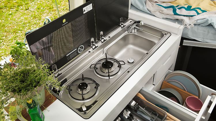 Die Küchenzeile mit Zwei-Flammen-Kocher und Spüle kann an beiden Seiten mit ausklappbaren Brettern verlängert werden, was eine üppige Arbeitsfläche zur Verfügung stellt. Beim Schnippeln auf dem rechten Verlängerungsteil sollte man allerdings Sorgfalt walten lassen, denn es liegt auf dem Doppelbett auf. Was dazu führen könnte, dass die Nachtruhe überraschendes bietet.
