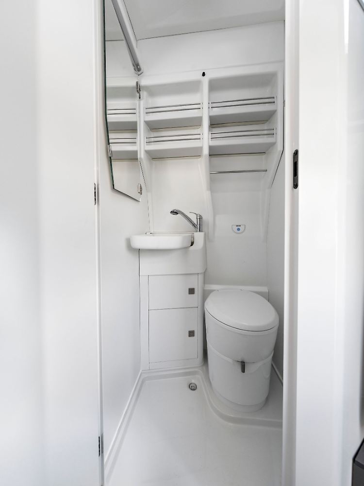 Wesentliches Differenzierungsmerkmal zum T6-California ist das vollwertige Bad mit klug durchdachtem Konzept. Regale, ein Unterschrank und ein Oberschrank mit schwenkbarem Spiegel nehmen alle notwendigen Bad- und Toiletten-Artikel auf. Der Clou ist das klappbare Waschbecken, das genügend Platz zum Duschen schafft. Und zwei Abflüsse sorgen dafür, dass das Wasser auch bei leicht schrägem Stand immer abläuft. Einen Duschvorhang sucht man allerdings ebenso vergebens wie einen Lichtschalter.
