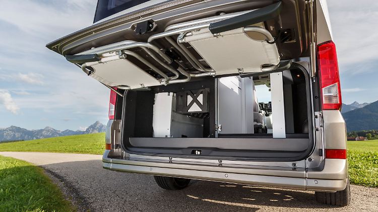 Größere Gepäckstücke finden ohnehin nur unter dem Doppelbett Platz. Während die beiden Unterschränke auf der Beifahrerseite mit den Tanks (Frischwasser 110 Liter, Abwasser 90 Liter) und den beiden 11-kg-Gasflaschen belegt sind, können die großen Staufächer auf der Fahrerseite für sperrigere Utensilien genutzt werden. Fahrräder oder Surfbretter lassen sich im Mittelgang unterbringen, sofern das Doppelbett seitlich hochgeklappt wird. Die Gemütlichkeit ist dann freilich weitgehend dahin. Ansatzweise vom kleineren California-Bruder übernommen ist die platzsparende Idee, zwei Campingstühle samt Außentisch in den beiden Hecktüren unterzubringen. Der Aufpreis von gut 500 Euro ist dafür allerdings sehr happig.