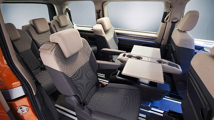 Weil die Handbremse genauso fehlt wie der Schaltknauf, ist die zweite Sitzreihe noch leichter zu erreichen. Wer den Weg sperren oder gerne eine Mittelkonsole haben will, kann den nun flexibel platzierbaren Multifunktionstisch aus dem Passagierabteil zwischen die beiden vorderen Stühle schieben. Insgesamt verspricht VW dank eines neuen Bodenschienen-Systems eine deutlich erhöhte Variabilität. Unter anderem sind die Sitze in Reihe drei nicht mehr zu einer Bank zusammengefasst, sondern einzeln verschieb- und ausbaubar.