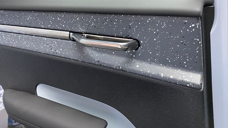 Zeit, um einzusteigen, wenngleich am Präsentationstag noch nicht gefahren werden darf. Und das Interieur überrascht mit seinem Designanspruch nicht, wenn man das Auto vorher schon gesehen hat. Ein bisschen architektonisches Fusionfood gefällig? Kühler Scandi-Chic trifft auf Terrazzo-Dekor. Zumindest erinnern die Zierelemente daran. Toll, was man aus gemahlenen Fensterrahmen und Rollläden so machen kann.