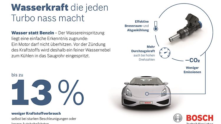 Wasser ist der Feind einer Verbrennung – sollte man meinen. In der Motorentechnik jedoch kann die Einspritzung von Wasser den Spritverbrauch senken. Automobilzulieferer Bosch ist zuversichtlich, dass in zwei bis drei Jahren die ersten Großserienautos mit der Technik ausgerüstet werden.