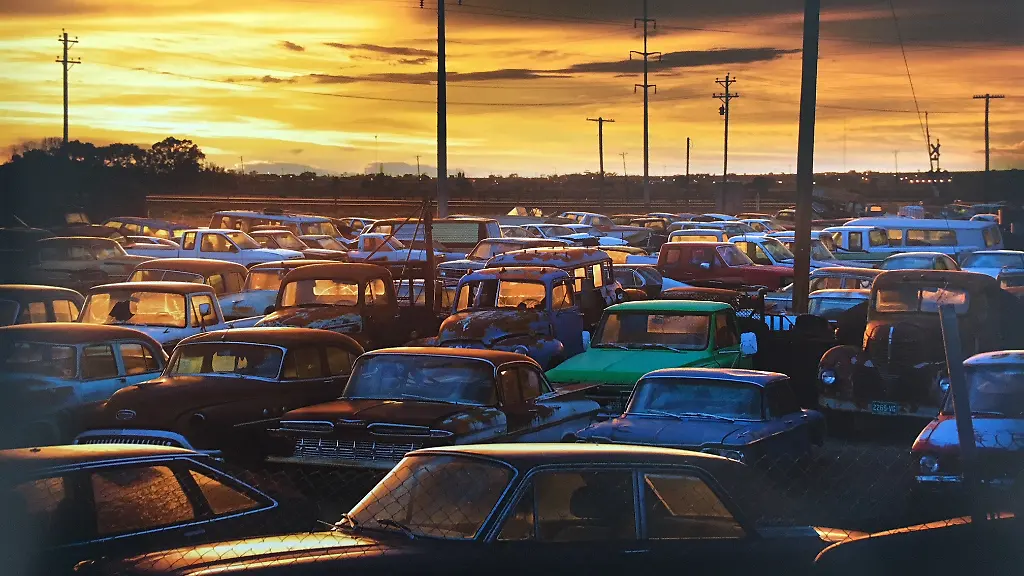 Zum Beispiel eine Geschichte zu den einst akkurat aufgereihten Fahrzeugen, die heute ohne Räder auf den Bodenplatten ruhen und deren Farbe langsam in das Einheitsbraun des Rostes wechselt. An anderer Stelle stehen die Reliquien neben verlassenen Häusern oder leuchten im Licht der untergehenden Sonne auf, als wollten sie Blätter und Unrat von sich abschütteln, um ein letztes Mal den Motor aufheulen zu lassen. Besonders fasziniert ein Bild, das einen völlig verrosteten Ford zeigt, hinter dem ein Wohnwagen steht; vor dessen Tür scheinen zwei Stühle auf die Bewohner zu warten. Eine surreale Szenerie, die ihresgleichen sucht. Weil sie so momentan, so endlos und so aussichtslos scheint.