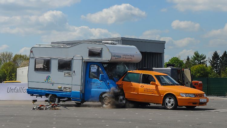 Als die Fahrzeuge zum Stehen gekommen sind, sieht man das Ausmaß des Schadens: Während die Front des Caravans eingedrückt ist, hat sich das Heck des Pkw bis auf Höhe der Hinterreifen geschoben - es ist quasi nicht mehr vorhanden. Die Fahrersitzlehne hat es aus ihrer aufrechten Stellung gerissen, darauf liegt der Fahrer-Dummy, der schwere Wirbelsäulen-Verletzungen davongetragen haben dürfte. Die Statistik zeigt, dass die Folgen für den Unfallgegner oft gravierender sind als für die Insassen des Reisemobils: Von den 2014 bei Wohnmobil-Unfällen Getöteten waren vier im Reisemobil selbst, aber elf bei den Unfallbeteiligten, so die Unfallforscher. Grund dafür sind die unterschiedlichen Masseverhältnisse.