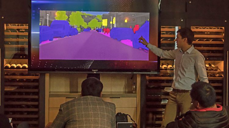 Schwieriger, so Marius Cordts, der für das Bildverstehen verantwortlich zeichnet, waren dann schon Nachtfahrten bei Regen. Hier mussten die Ingenieure neu justieren und der Computer musste wieder lernen. Inzwischen ist auch das kein Problem mehr. Aber die Rechenleistungen, denen immer noch ein Binärcode zu Grunde liegt, sind gigantisch. Sieben Terrabyte pro Stunde müssen bearbeitet werden, wobei jedes Bild zwei Megapixel und eine Frame-Rate von 20 Hz hat. Das sind Datenmengen, für die man vor Jahren noch Rechner in der Größe eines Sattelschleppers gebraucht hätte.