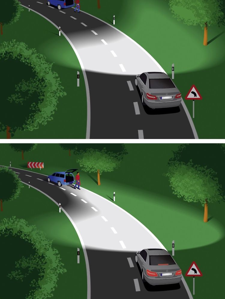 Fernlicht-Assistent: Ist der Fernlicht-Assistent eingeschaltet, blendet das Auto je nach Verkehrssituation selbstständig ab und wieder auf. Die Frontkamera erkennt entgegenkommende Autos und Motorräder ebenso wie vorausfahrende Fahrzeuge und schaltet das Fernlicht herunter. Je nach System ist es auch möglich, dass das Fernlicht andere Verkehrsteilnehmer ausblendet, die Umgebung aber weiterhin ausleuchtet.