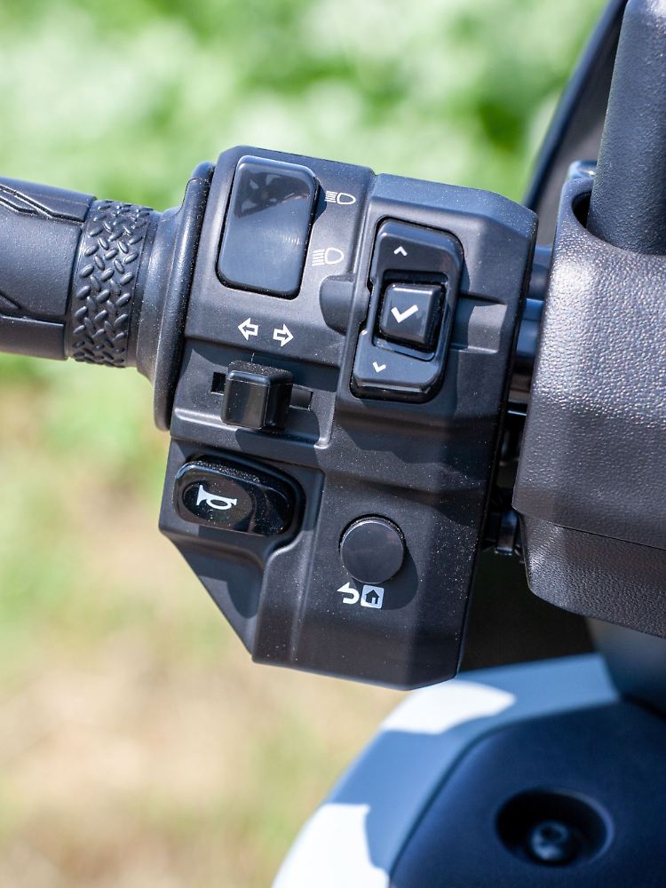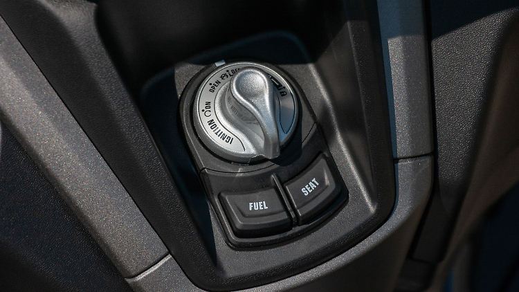 Zum Starten mit dem Transponder in der Tasche wird der zentrale Bedienknopf eingedrückt und ganz nach links gedreht, dann ist das Triebwerk startbereit. In der Stellung dazwischen sind die Tasten zur elektrischen Sitzbank- und Tankklappenöffnung aktiviert.